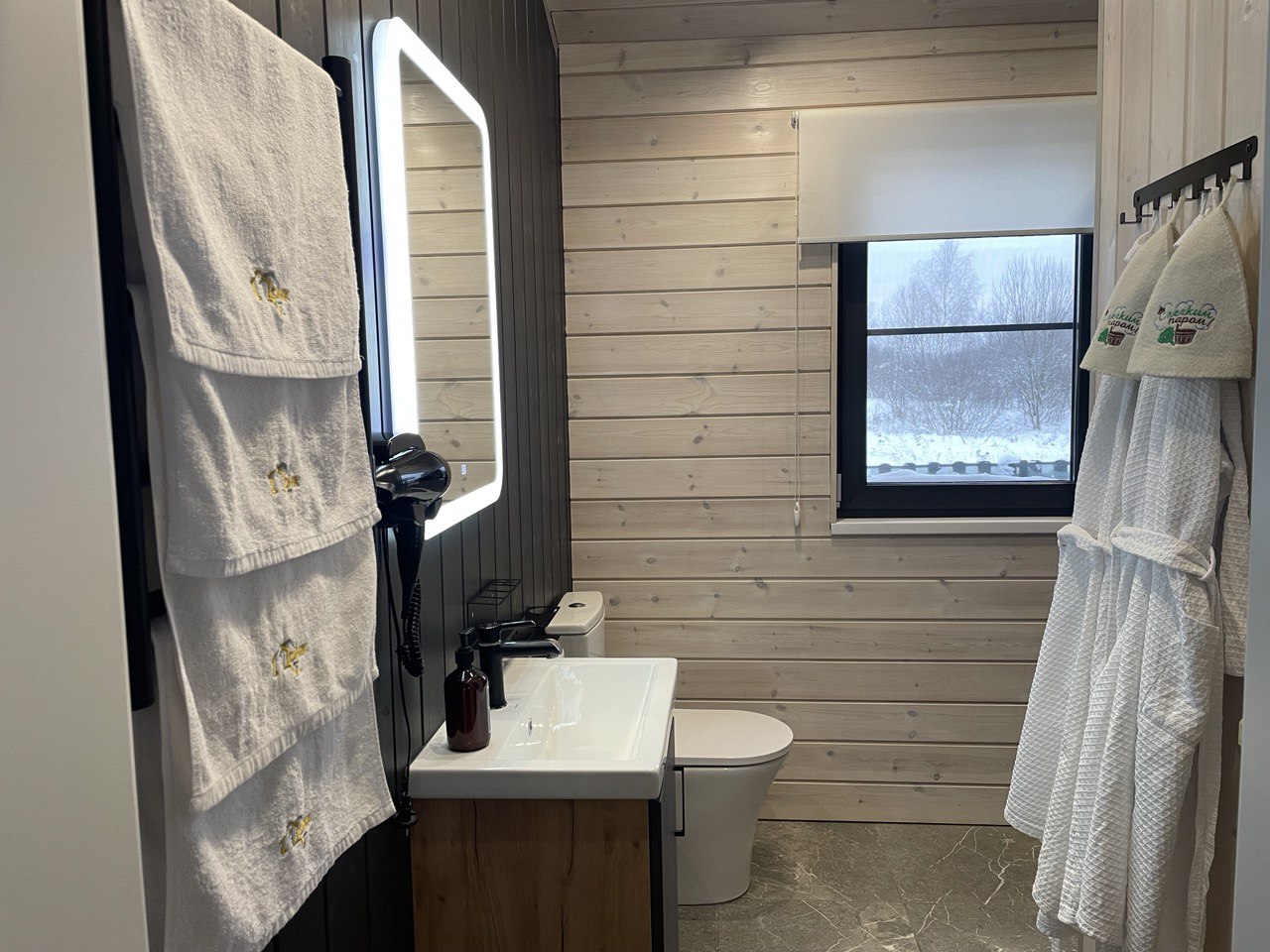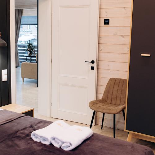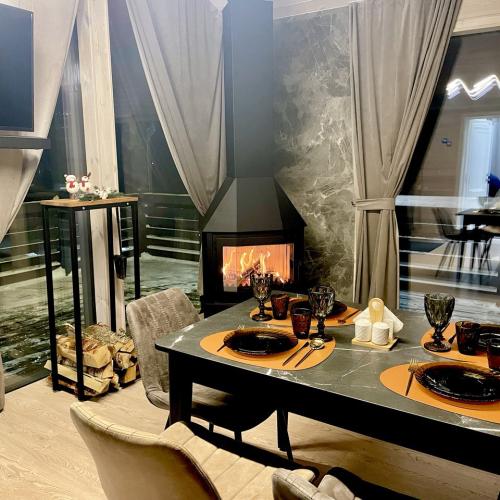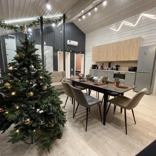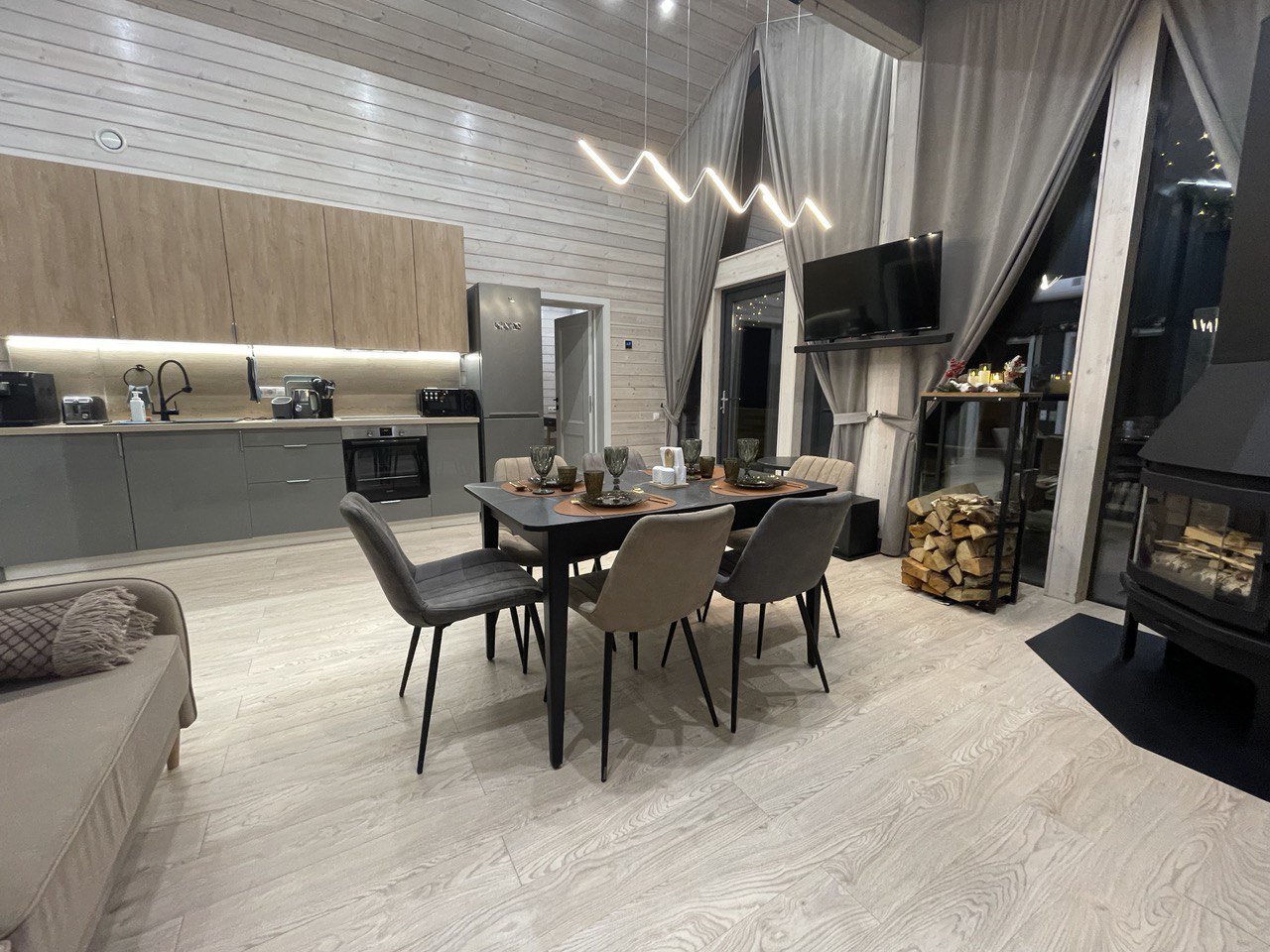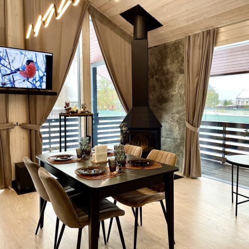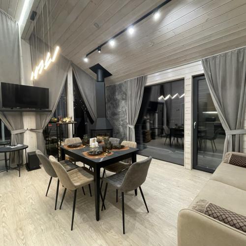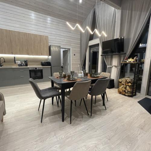 Дом полностью оборудован для комфортного проживания. В вашем распоряжении электрическая сауна на 2 человек, три спальни (две спальни с панорамными окнами и двуспальными кроватями с ортопедическими матрасами и одна спальня-кабинет с диваном и рабочим столом), просторная кухня-гостиная с дровяным камином, раскладным диваном, Smart TV и саундбаром. Во всех помещениях тёплые полы и конвекторы. Кухня оснащена кофемашиной с капучинатором, тостером, чайником, фильтром для воды, микроволновой печью, холодильником, плитой, духовым шкафом, всей необходимой посудой и столовыми принадлежностями. В санузле тёплый пол, душевая кабина, сауна, фен и зеркало с подсветкой. Бесплатно предоставляются постельное бельё, полотенца, халаты, тапочки, шампунь и гель для душа.