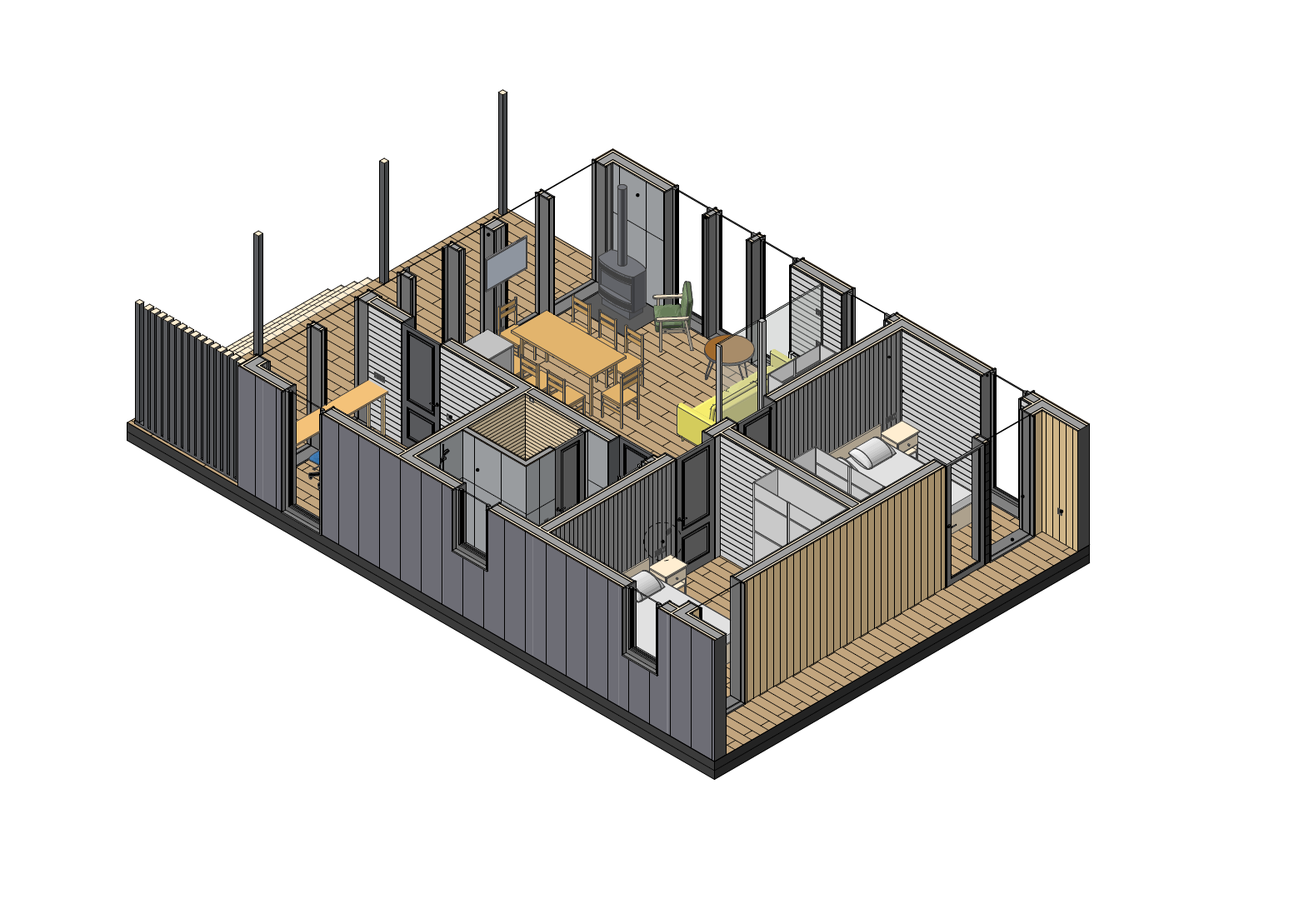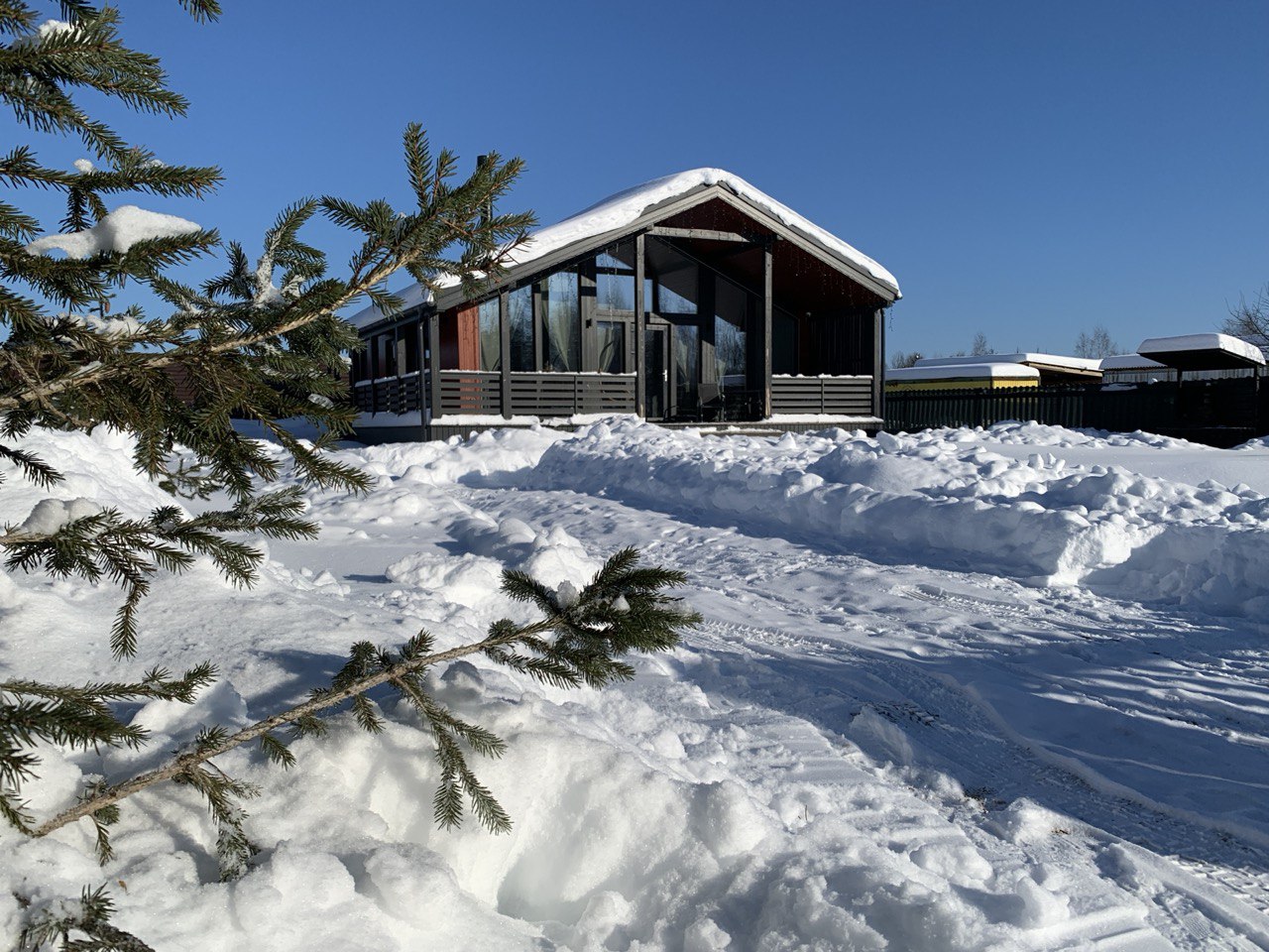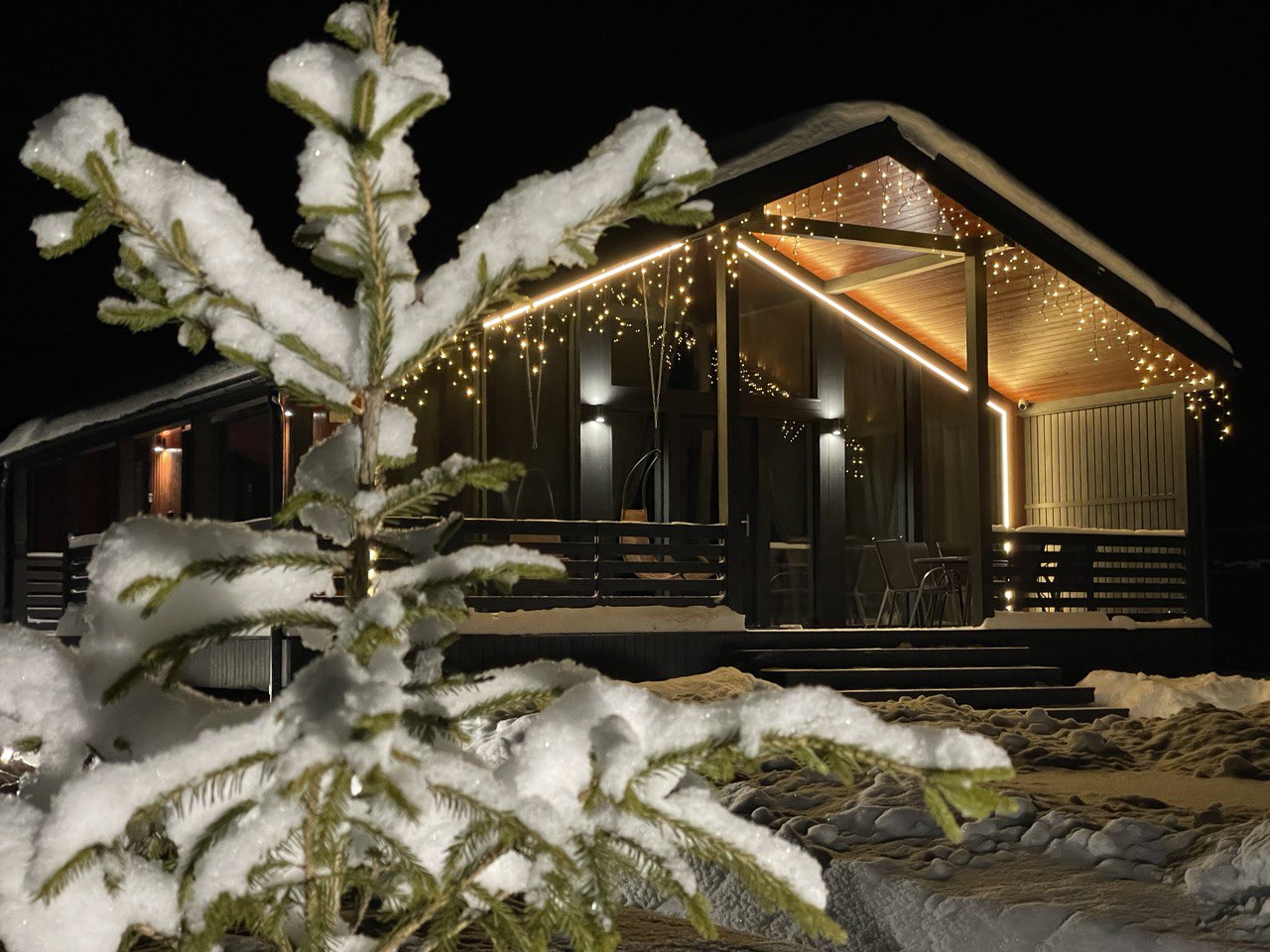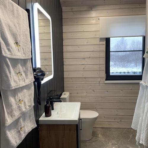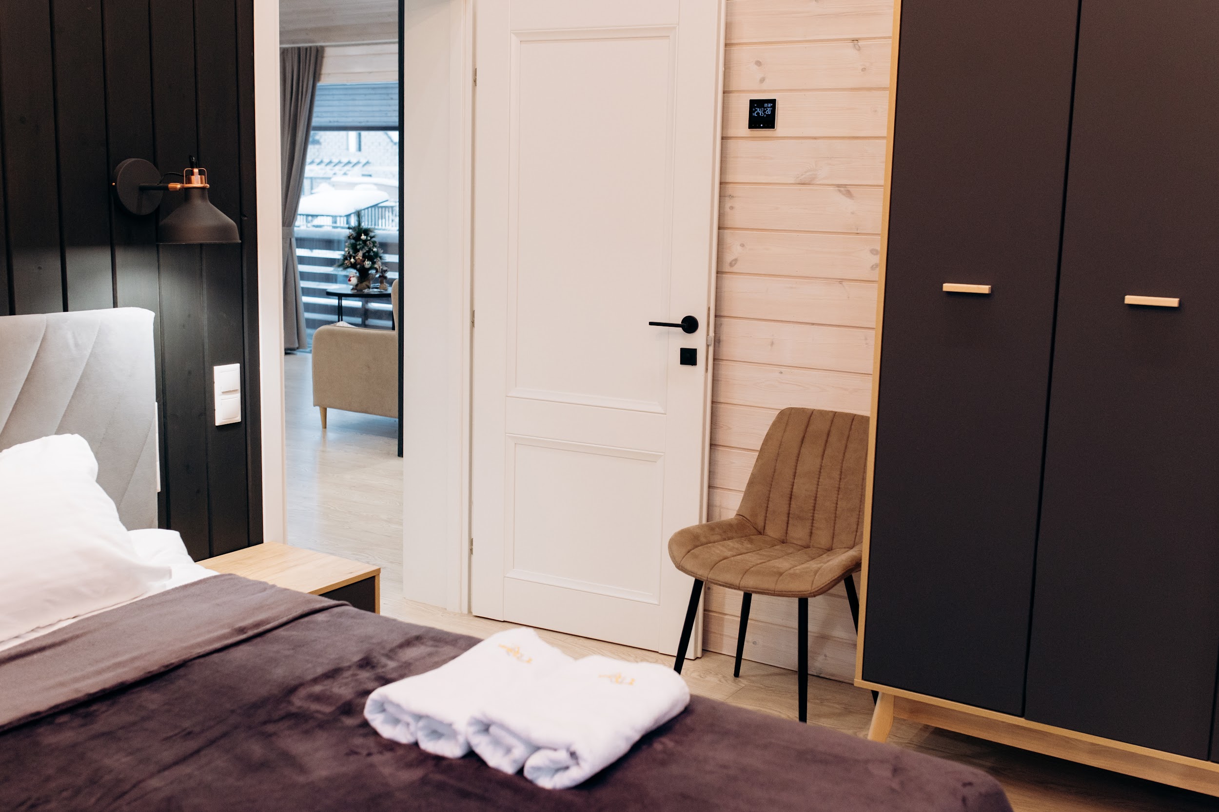 Дом полностью оборудован для комфортного проживания. В вашем распоряжении электрическая сауна на 2 человек, три спальни (две спальни с панорамными окнами и двуспальными кроватями с ортопедическими матрасами и одна спальня-кабинет с диваном и рабочим столом), просторная кухня-гостиная с дровяным камином, раскладным диваном, Smart TV и саундбаром. Во всех помещениях тёплые полы и конвекторы. Кухня оснащена кофемашиной с капучинатором, тостером, чайником, фильтром для воды, микроволновой печью, холодильником, плитой, духовым шкафом, всей необходимой посудой и столовыми принадлежностями. В санузле тёплый пол, душевая кабина, сауна, фен и зеркало с подсветкой. Бесплатно предоставляются постельное бельё, полотенца, халаты, тапочки, шампунь и гель для душа.