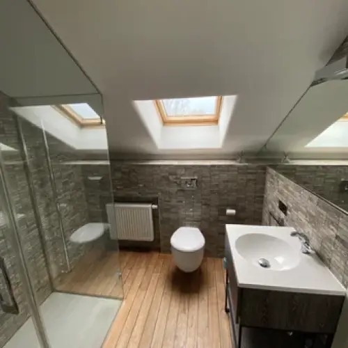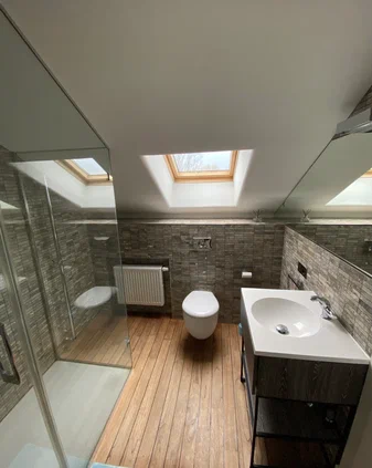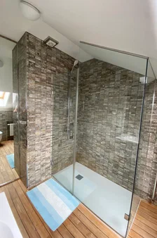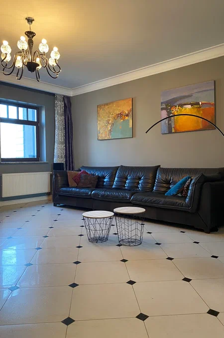 Две спальни (180×200 и 160×190), оснащённые канальным кондиционером. Санузел с просторной душевой кабиной и большими зеркалами. Также на этаже есть уютная зона отдыха — холл с угловым диваном.