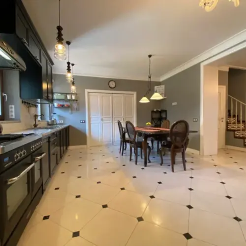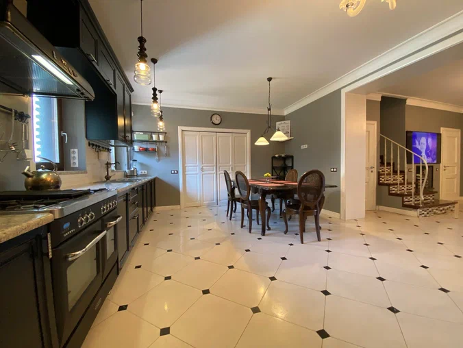 Просторная кухня-гостиная 60 м² с дровяным камином. Кухня полностью укомплектована посудой и техникой (включая винный шкаф, посудомоечную машину, тостер, набор бокалов). В гостиной — большой мягкий диван, телевизор 4K и акустическая система. Есть выход во внутренний уютный дворик с мангальной зоной. Также на этаже — гостевой санузел и отдельная постирочная со стиральной и сушильной машинами Miele.